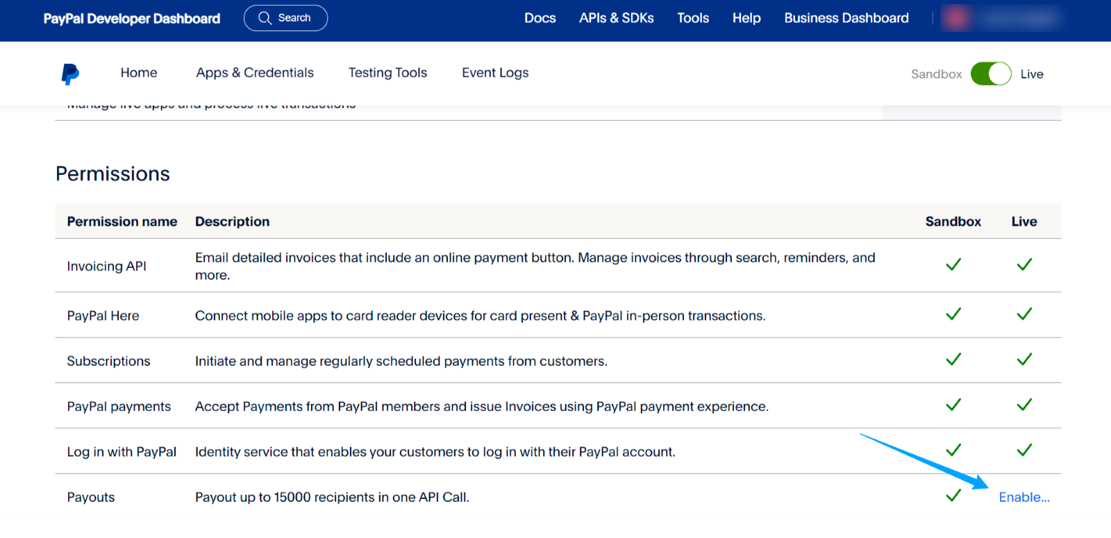 If you see the "Enable" link, click on it. You will likely be prompted to contact PayPal and request activation of the Payouts API feature for your account.