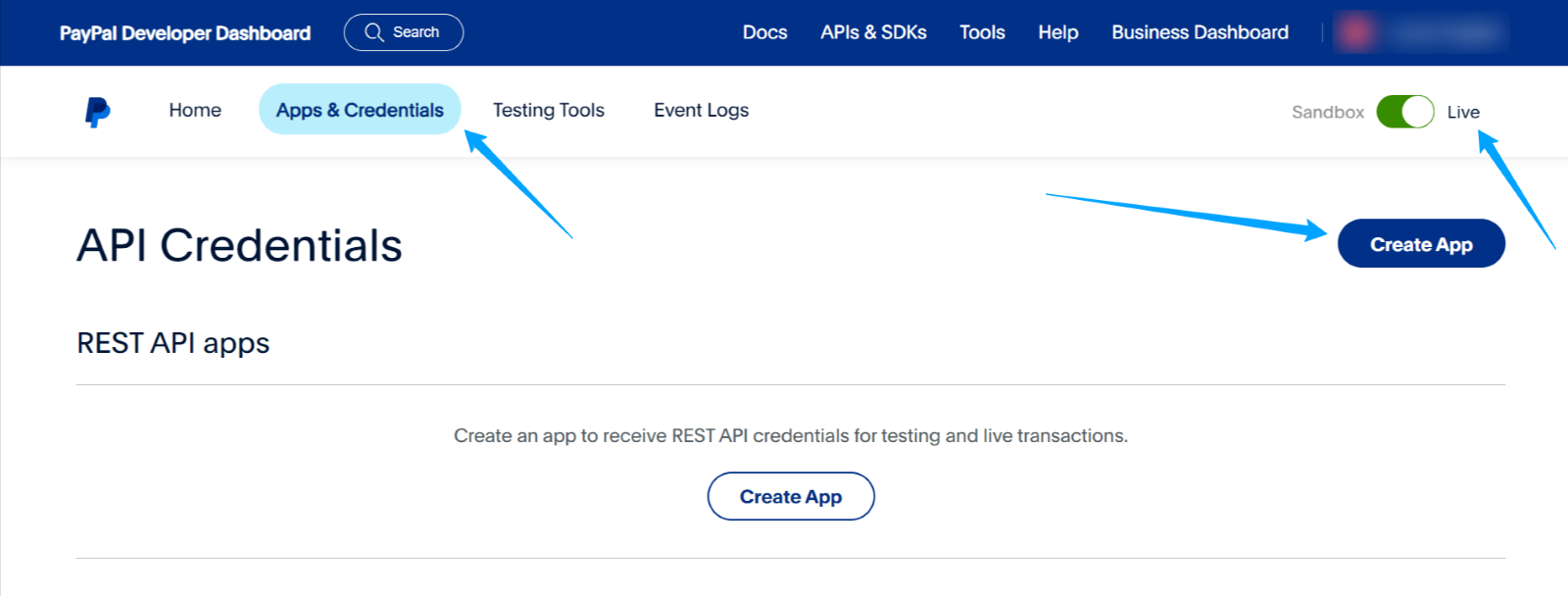 Note: If you see "Live/Sandbox" in the top-right corner after creating the app, ensure that "Live" is selected.