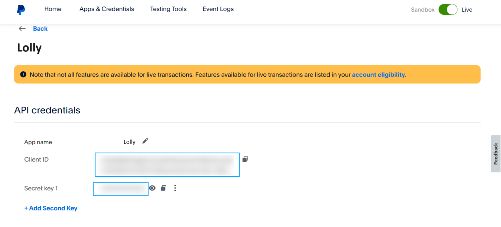 Copy the "Client ID" and "Secret Key" values and paste them into the corresponding fields in the Lolly PayPal integration form.